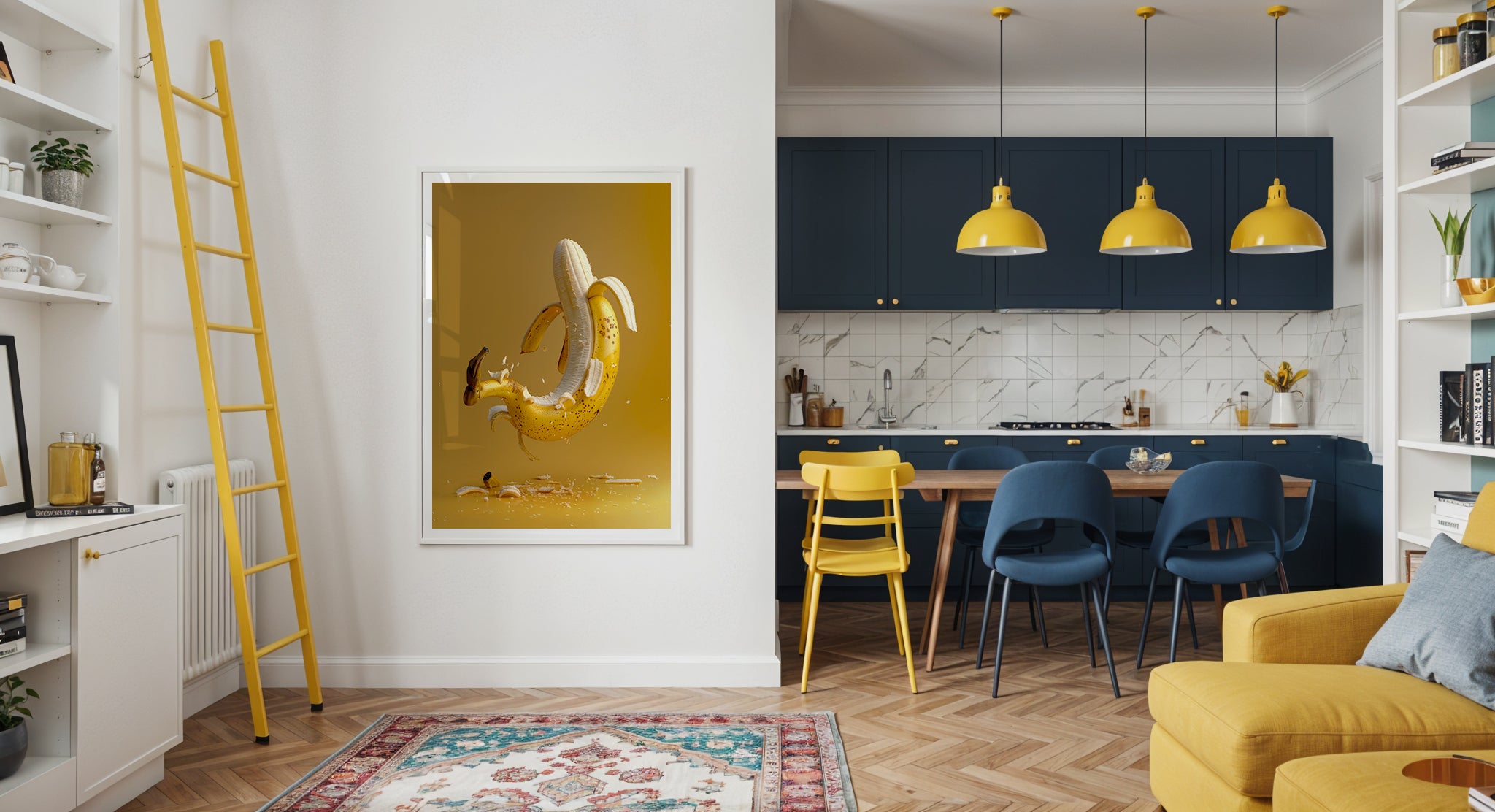 El diseño fue diseñado para integrarse a la perfección en este espacio al combinarse con su paleta de colores, estilo y estado de ánimo. Los tonos amarillos cálidos complementan las luces colgantes, la silla y la escalera, mientras que los acentos más oscuros se equilibran con los gabinetes azul marino. Su estética lúdica pero refinada se alinea con el diseño moderno de la habitación, agregando carácter sin abrumar el espacio. El marco y la escala se consideraron cuidadosamente para crear un punto focal cohesivo e intencional.