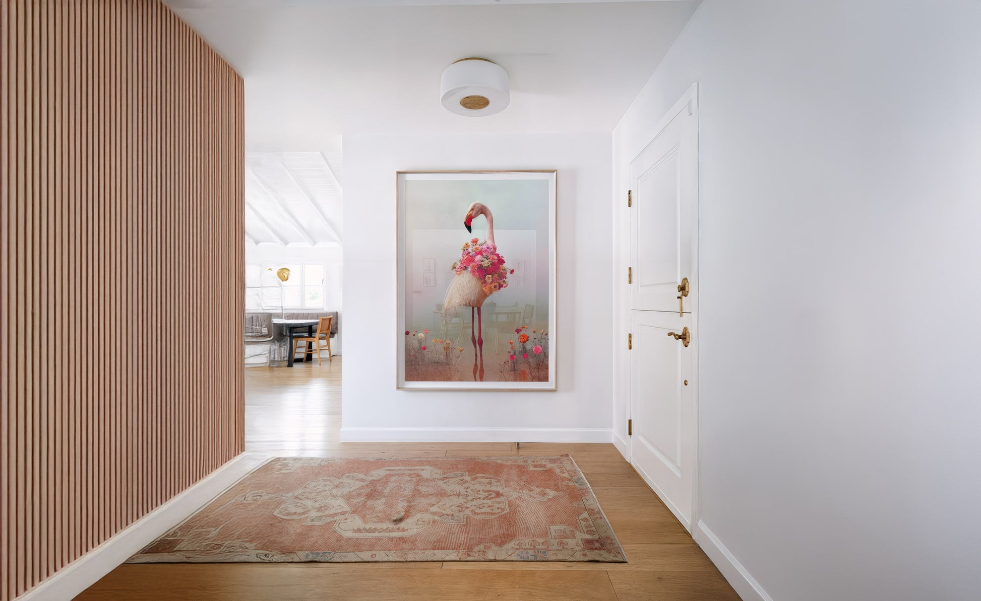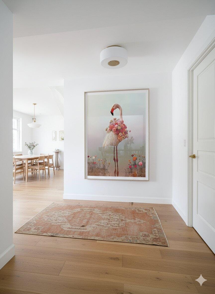 Desde que colgué esta obra en la entrada, la casa tiene otra energía. Es dulce, inesperada y tiene algo poético que no pasa desapercibido. Me encanta cómo combina lo surreal con lo delicado. Todo el que entra se queda mirándola con una sonrisa