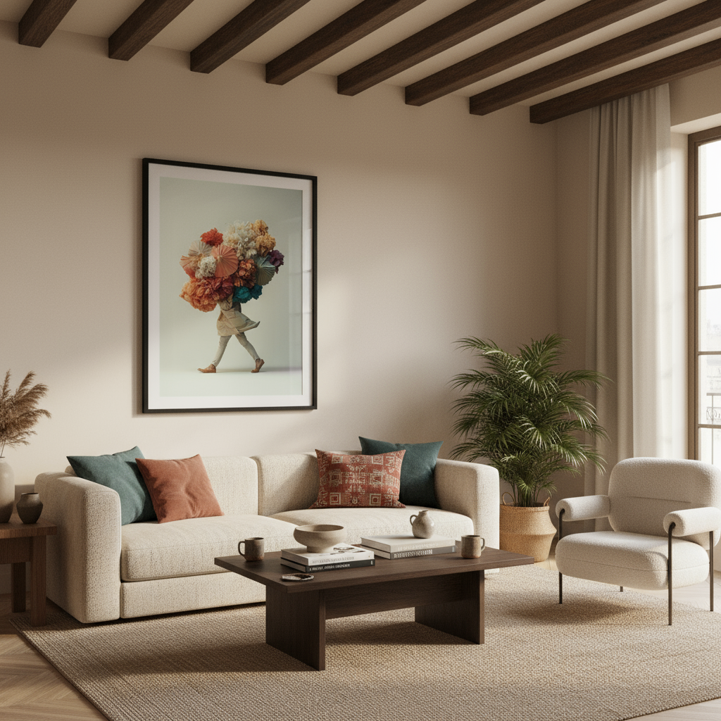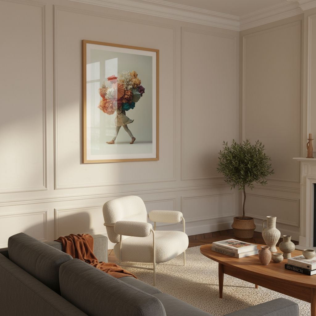 El marco es más que un simple complemento, es una extensión de la obra. Algunos prefieren la elegancia discreta de un diseño en negro, blanco o madera natural, mientras que otros apuestan por marcos con colores vibrantes, texturas o patrones que aportan personalidad. No hay una fórmula correcta, solo la que mejor conecte contigo.