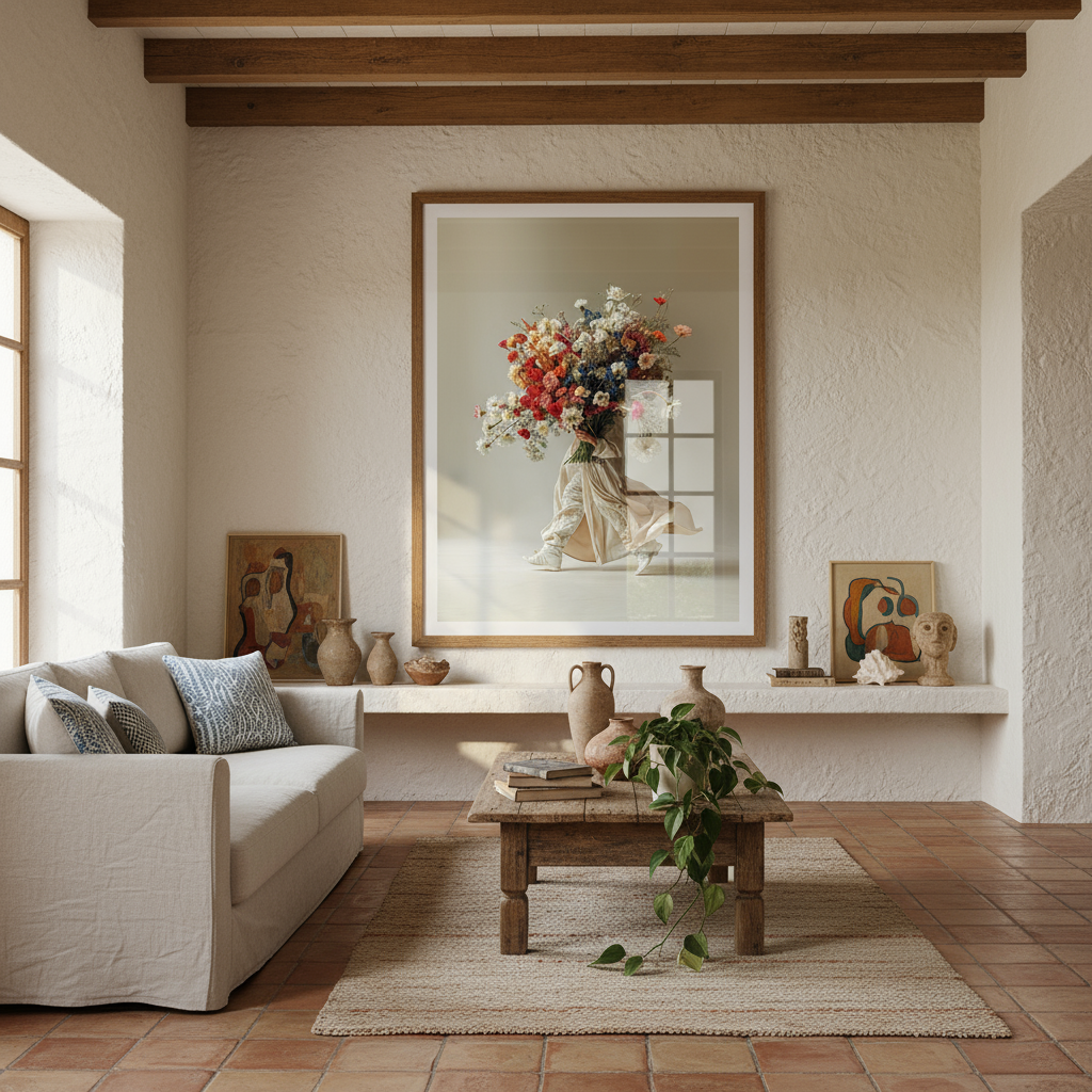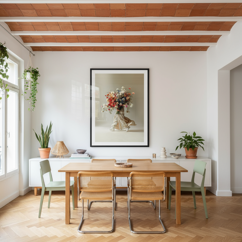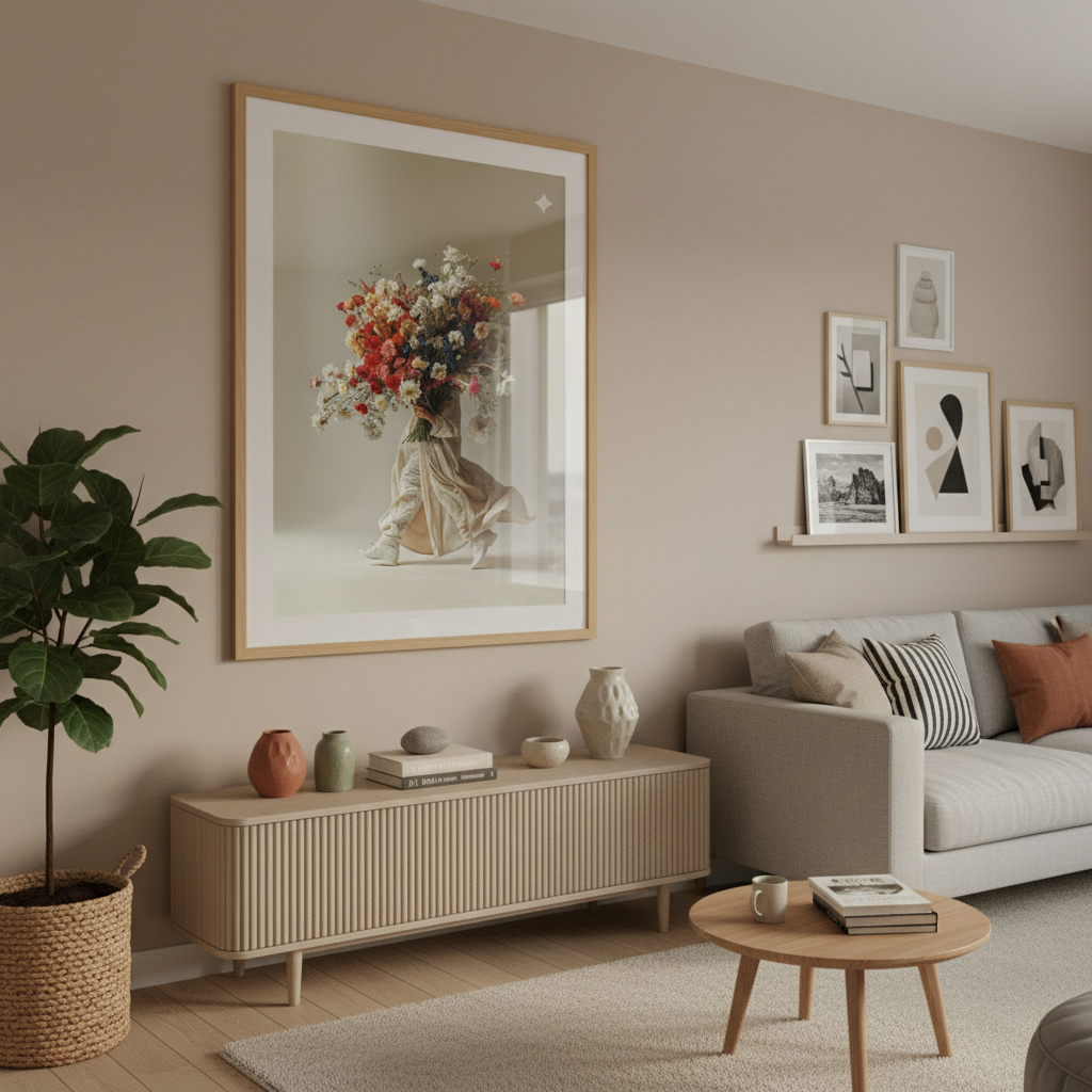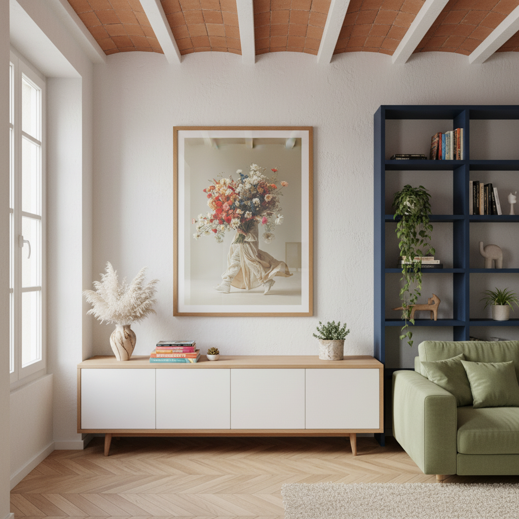 El marco es más que un simple complemento, es una extensión de la obra. Algunos prefieren la elegancia discreta de un diseño en negro, blanco o madera natural, mientras que otros apuestan por marcos con colores vibrantes, texturas o patrones que aportan personalidad. No hay una fórmula correcta, solo la que mejor conecte contigo.