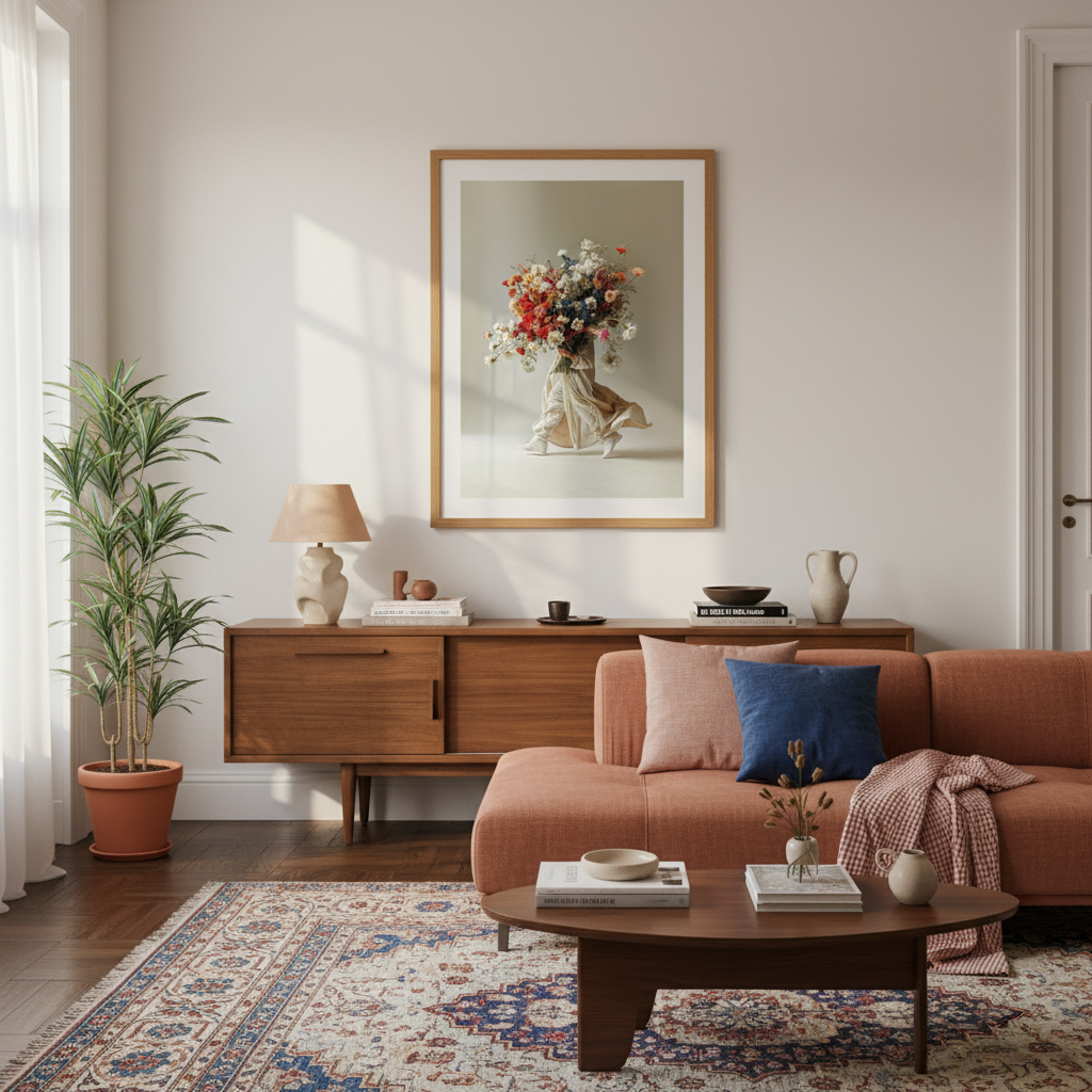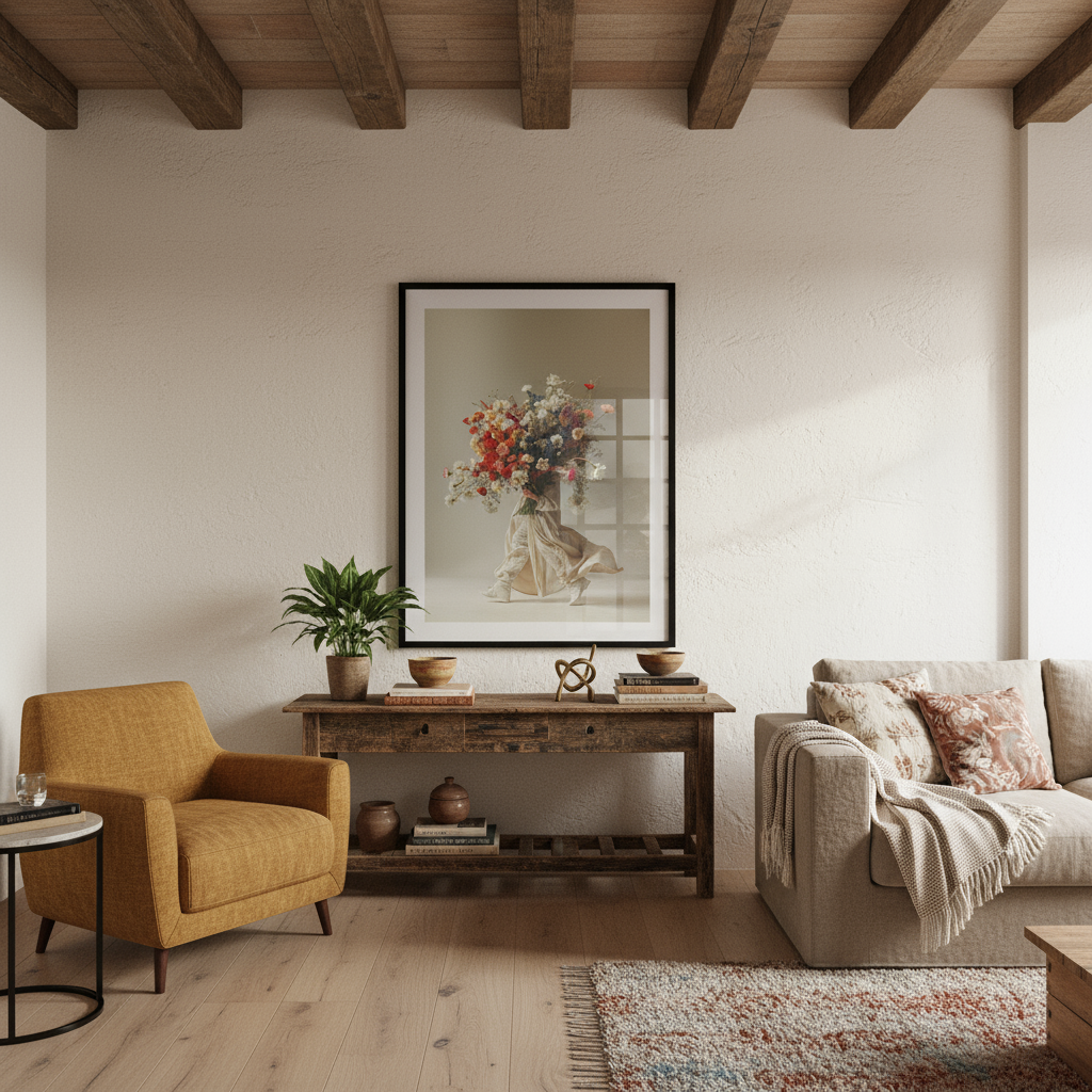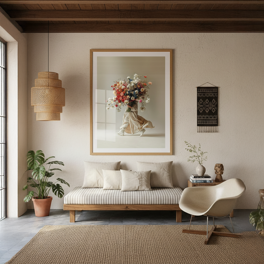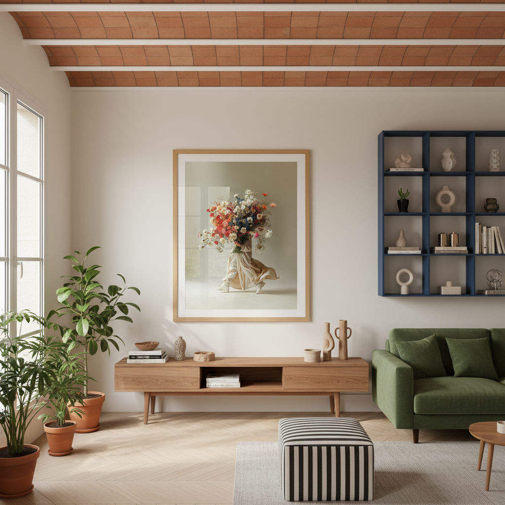 El marco es más que un simple complemento, es una extensión de la obra. Algunos prefieren la elegancia discreta de un diseño en negro, blanco o madera natural, mientras que otros apuestan por marcos con colores vibrantes, texturas o patrones que aportan personalidad. No hay una fórmula correcta, solo la que mejor conecte contigo.
