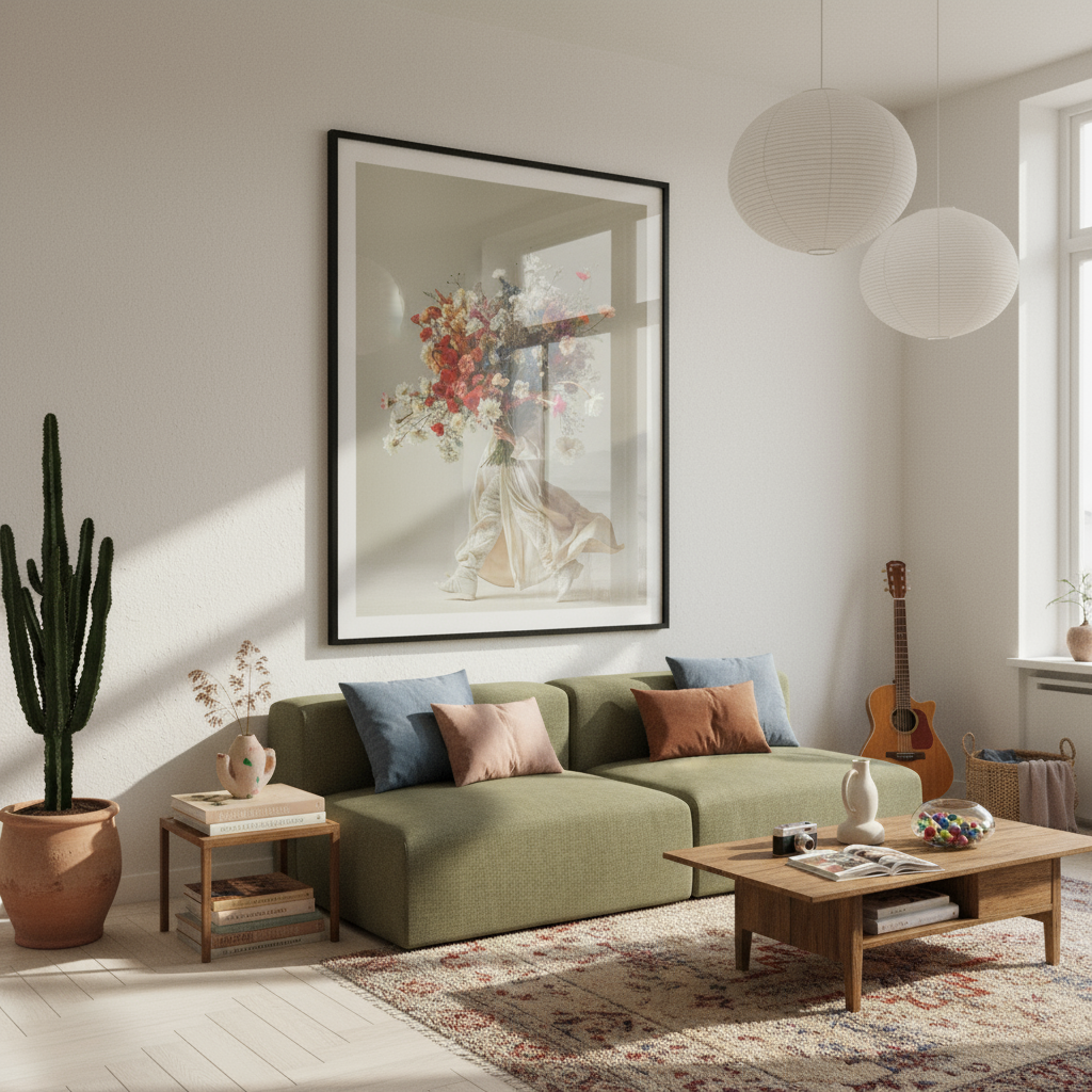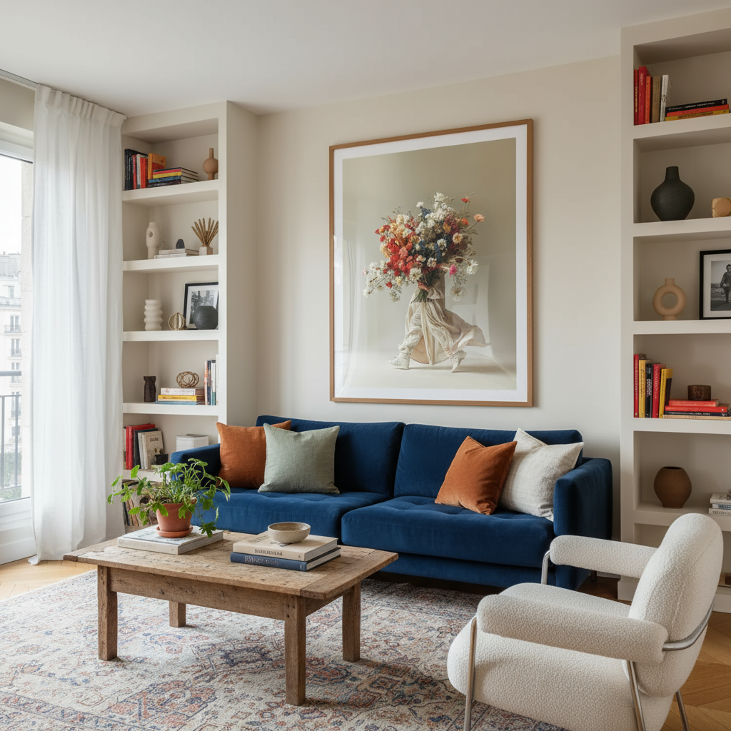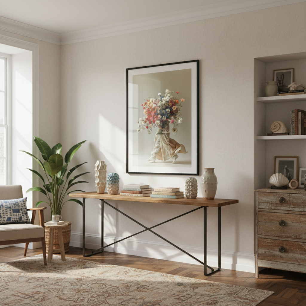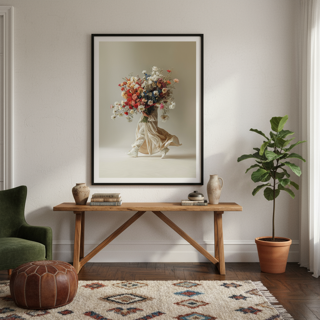 El marco es más que un simple complemento, es una extensión de la obra. Algunos prefieren la elegancia discreta de un diseño en negro, blanco o madera natural, mientras que otros apuestan por marcos con colores vibrantes, texturas o patrones que aportan personalidad. No hay una fórmula correcta, solo la que mejor conecte contigo.