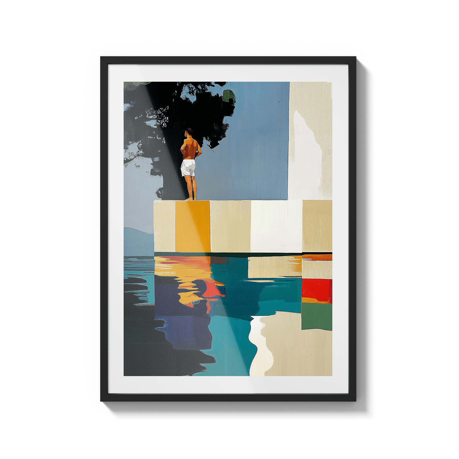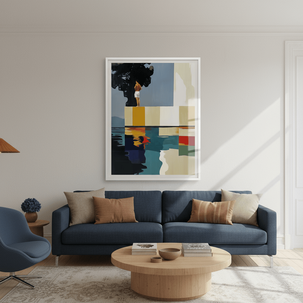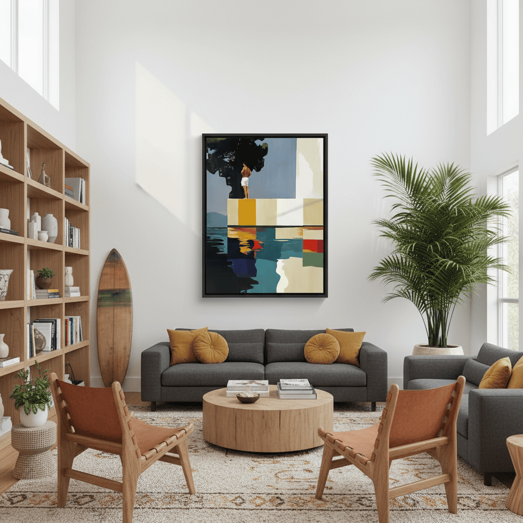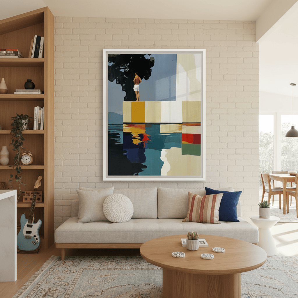 Hay paisajes que no se miran, se recuerdan. Esta pieza es una abstracción del tramo final de Les Rotes, en Dénia, donde el paseo se acaba, el mar golpea las rocas y una casa blanca observa en silencio desde lo alto. Aquí, los acantilados se transforman en bloques de color, la escalera en un trampolín suspendido y el agua en un espejo quieto. No representa un lugar, sino una emoción: ese instante suspendido antes del salto. El sol en la espalda, el aire contenido y la certeza de que incluso el verano tiene un borde.