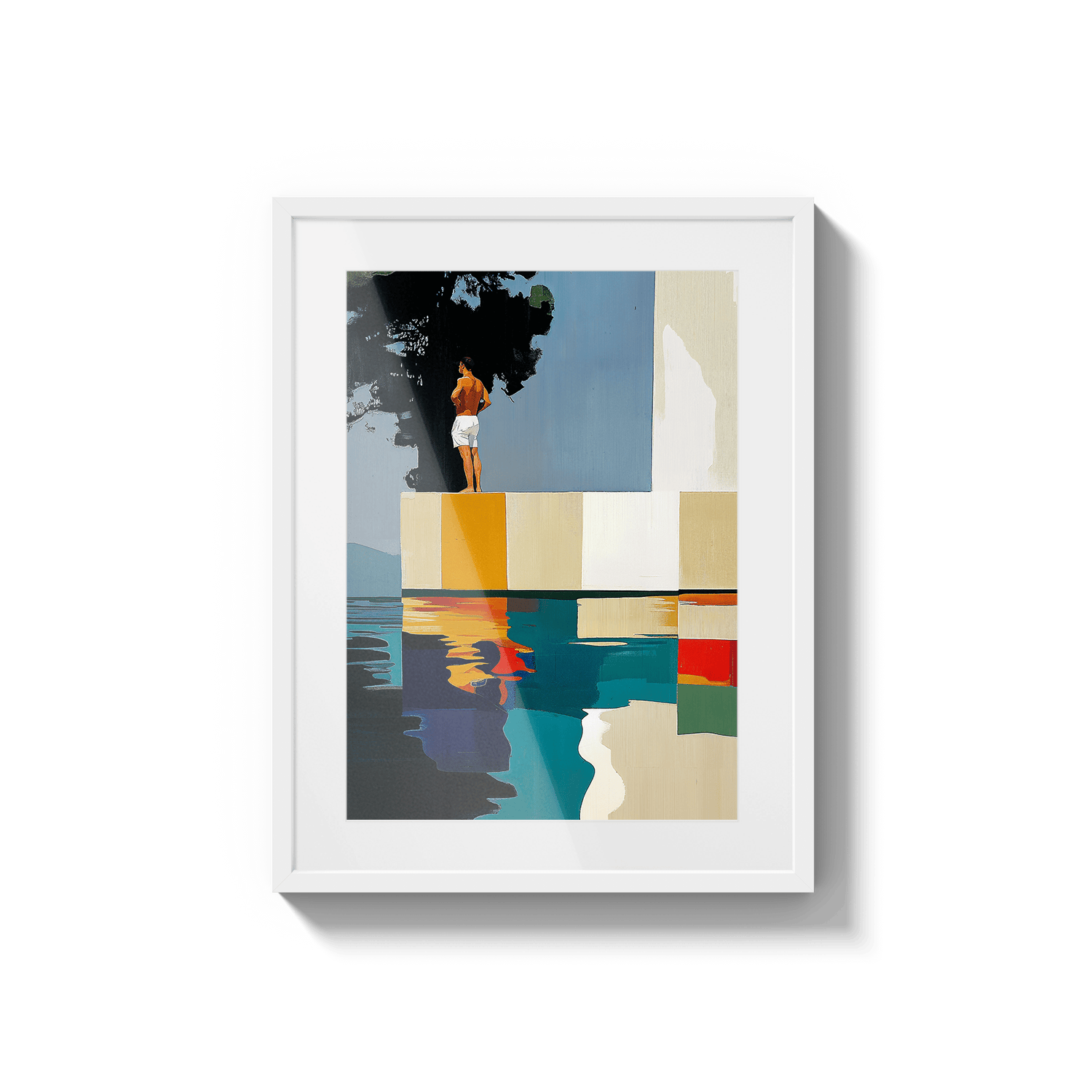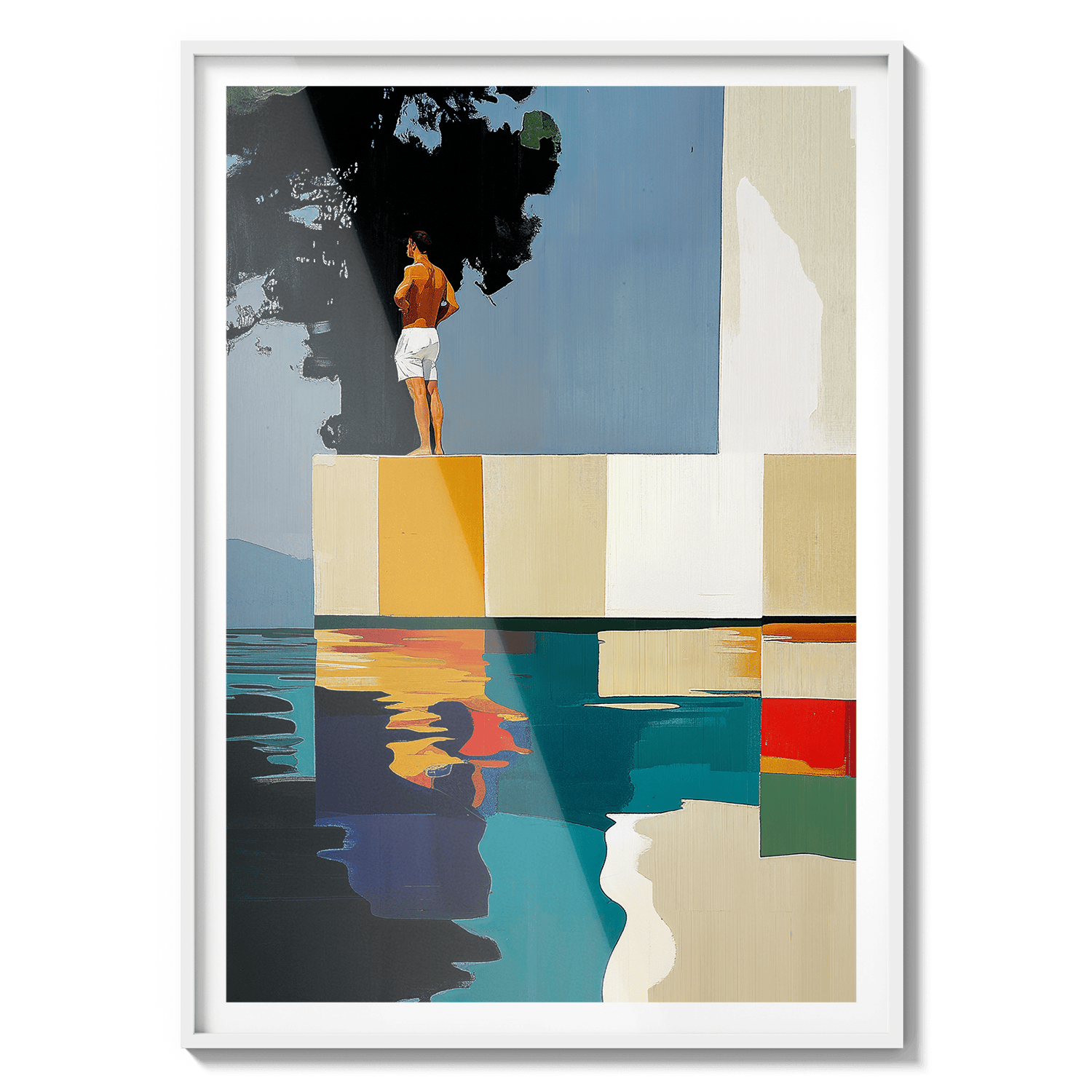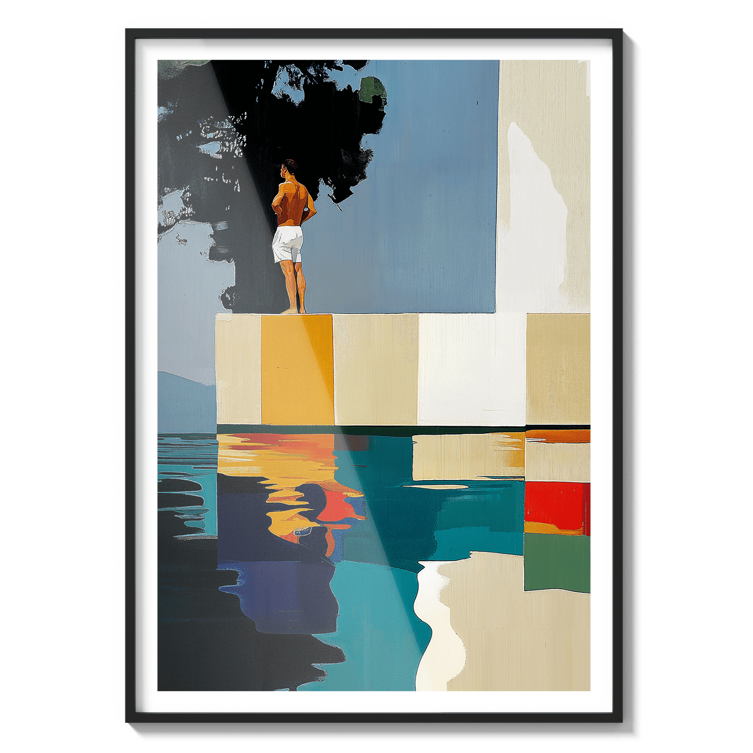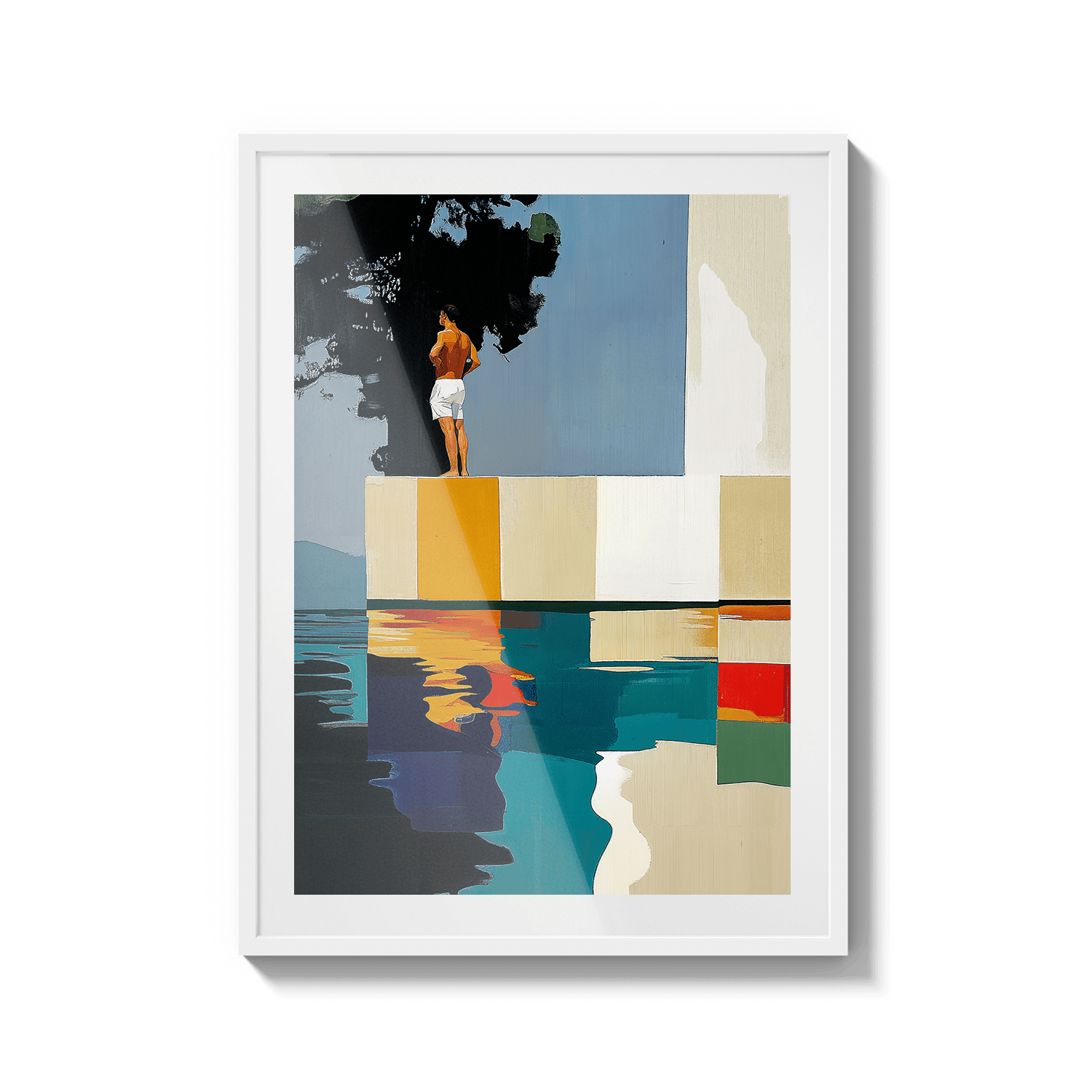 Hay paisajes que no se miran, se recuerdan. Esta pieza es una abstracción del tramo final de Les Rotes, en Dénia, donde el paseo se acaba, el mar golpea las rocas y una casa blanca observa en silencio desde lo alto. Aquí, los acantilados se transforman en bloques de color, la escalera en un trampolín suspendido y el agua en un espejo quieto. No representa un lugar, sino una emoción: ese instante suspendido antes del salto. El sol en la espalda, el aire contenido y la certeza de que incluso el verano tiene un borde.
