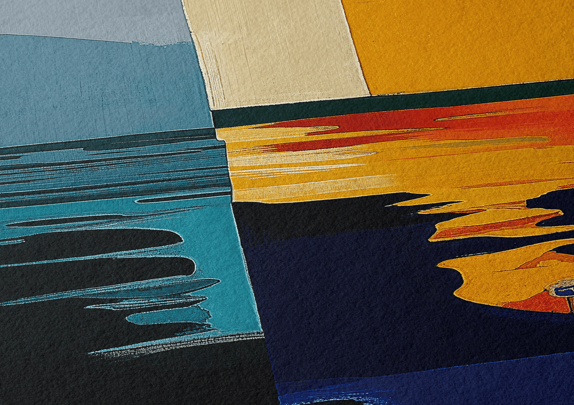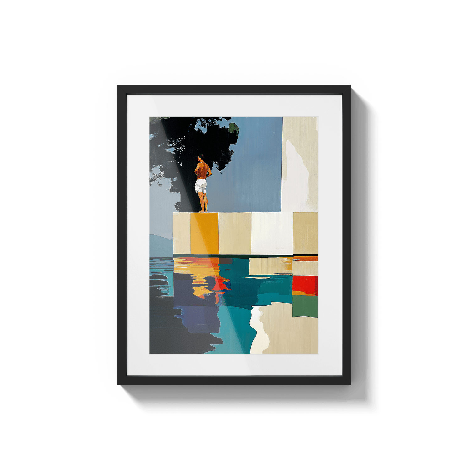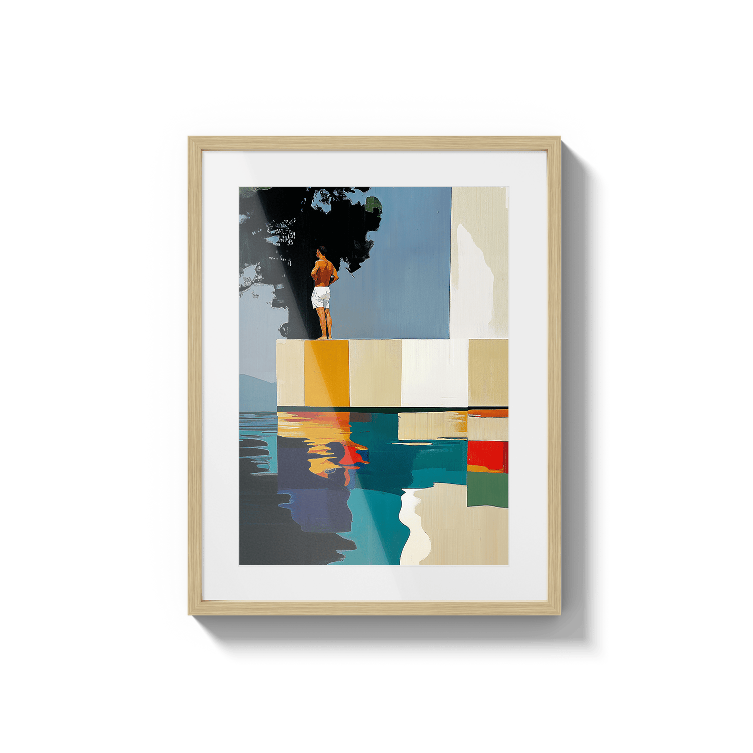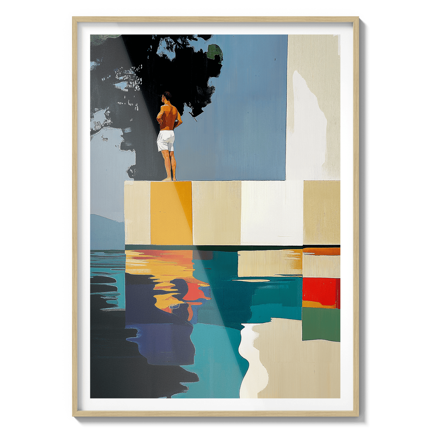 Hay paisajes que no se miran, se recuerdan. Esta pieza es una abstracción del tramo final de Les Rotes, en Dénia, donde el paseo se acaba, el mar golpea las rocas y una casa blanca observa en silencio desde lo alto. Aquí, los acantilados se transforman en bloques de color, la escalera en un trampolín suspendido y el agua en un espejo quieto. No representa un lugar, sino una emoción: ese instante suspendido antes del salto. El sol en la espalda, el aire contenido y la certeza de que incluso el verano tiene un borde.