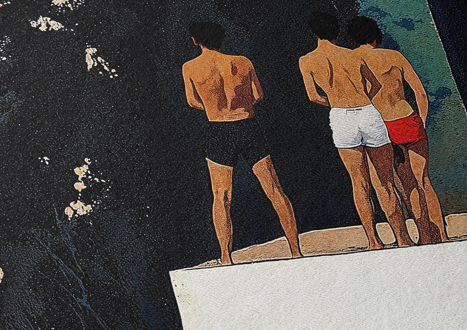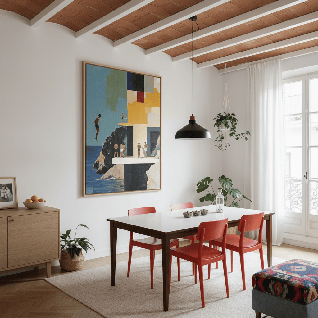 Hay paisajes que no se miran, se recuerdan. Esta pieza es una abstracción del tramo final de Les Rotes, en Dénia, donde el paseo se acaba, el mar golpea las rocas y una casa blanca observa en silencio desde lo alto. Aquí, los acantilados se transforman en bloques de color, la escalera en un trampolín suspendido y el agua en un espejo quieto. No representa un lugar, sino una emoción: ese instante suspendido antes del salto. El sol en la espalda, el aire contenido y la certeza de que incluso el verano tiene un borde.