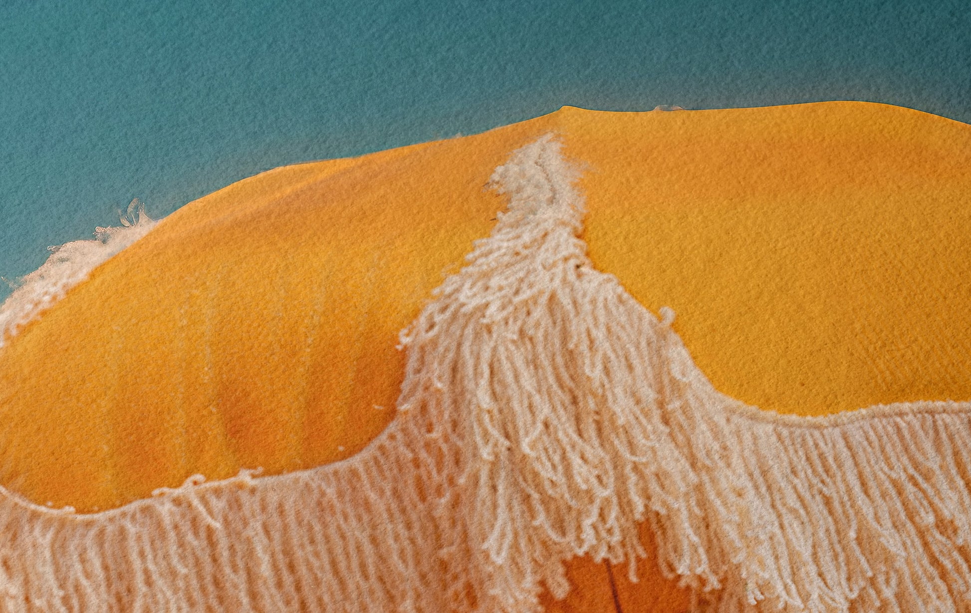 Una sombrilla amarilla se alza sobre un paisaje casi vacío: roca clara, horizonte plano, aire caliente y sin urgencia.
