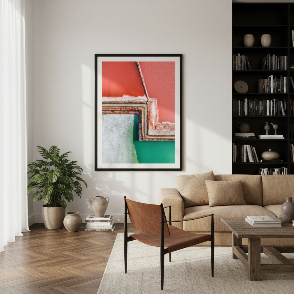 Vista desde las alturas, la tierra se convierte en un lienzo de contrastes y armonía. Pink × Turquoise Altitude captura el encuentro entre rosados suaves y aguas turquesas brillantes, delimitadas por bordes minerales que parecen dibujados a mano. Inspirada en paisajes naturales como salinas, lagunas o costas erosionadas por el tiempo, esta obra transforma la geografía en emoción. Es un diálogo entre lo cálido y lo sereno, entre lo natural y lo abstracto, donde el color se convierte en territorio y la quietud, en movimiento.