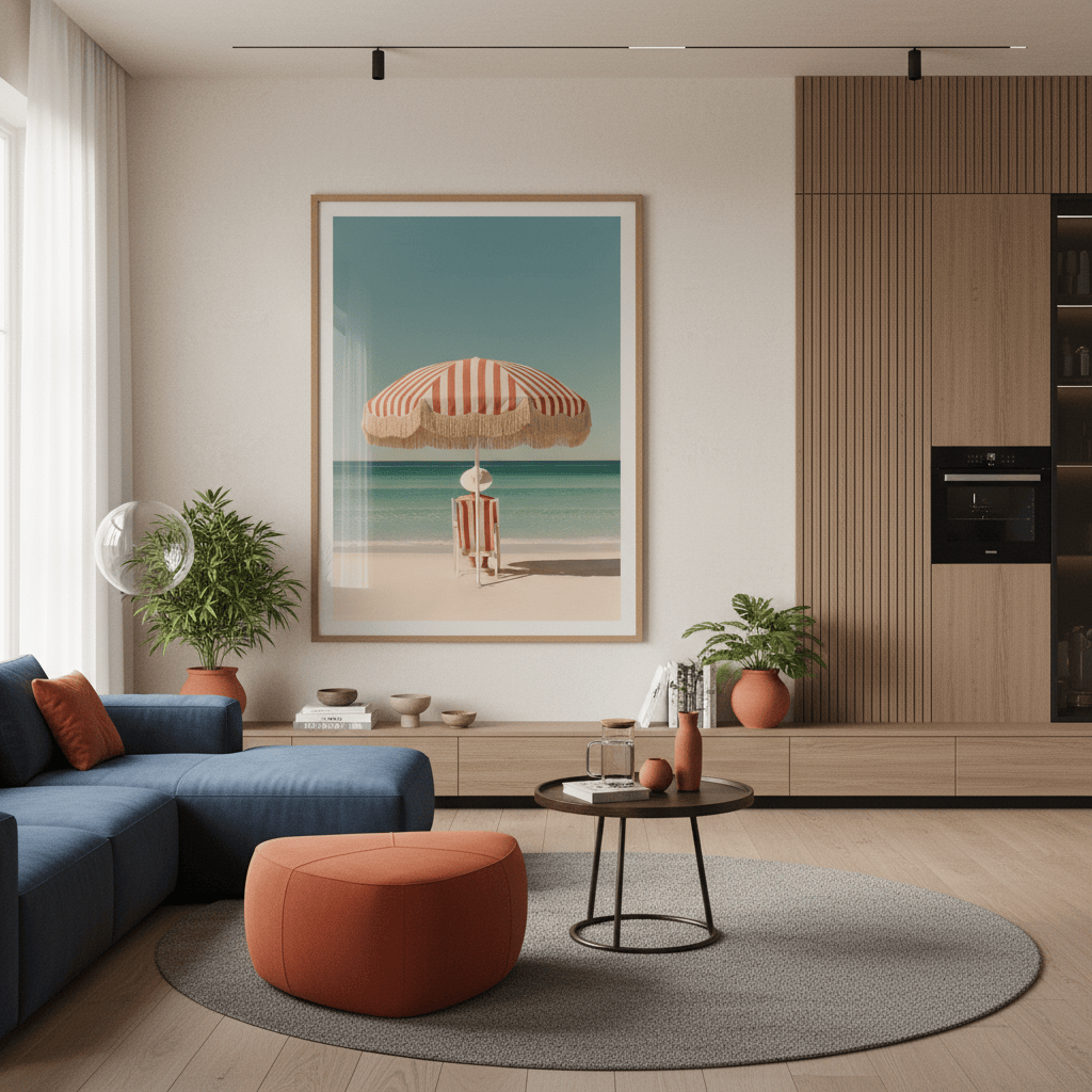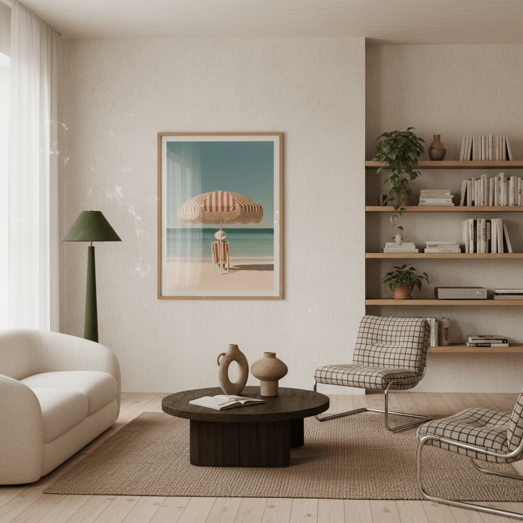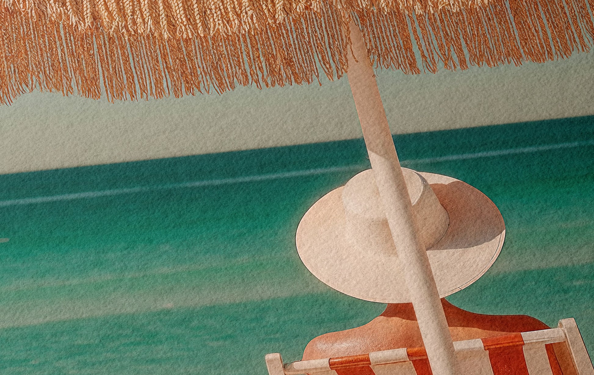 Una sombrilla roja y blanca descansa junto al mar, proyectando una sombra que se siente más como un recuerdo que como un refugio. Sus rayas clásicas y el fleco dorado evocan los veranos dorados de la Riviera italiana en los años 60: cinematográficos, despreocupados, bañados de sol.