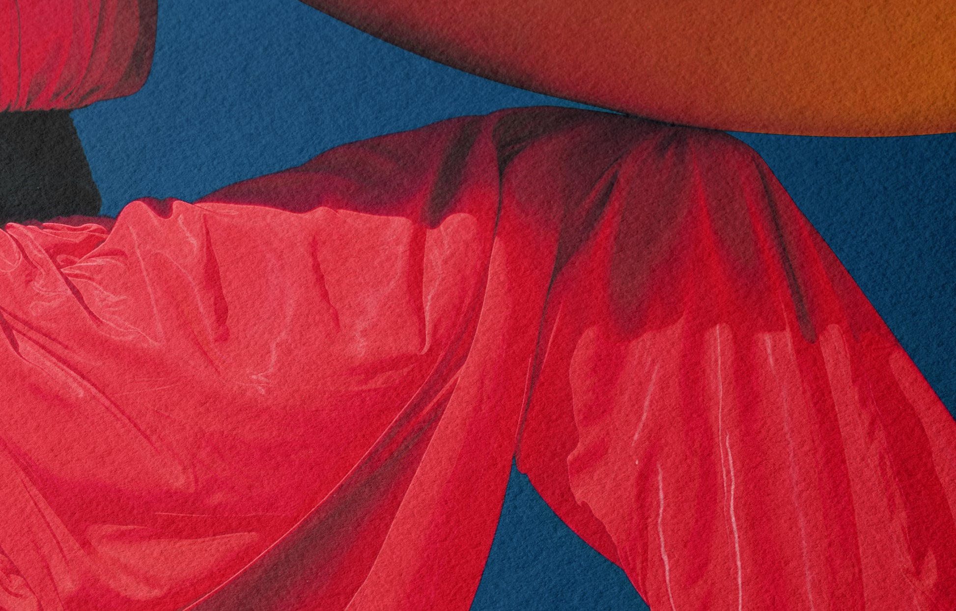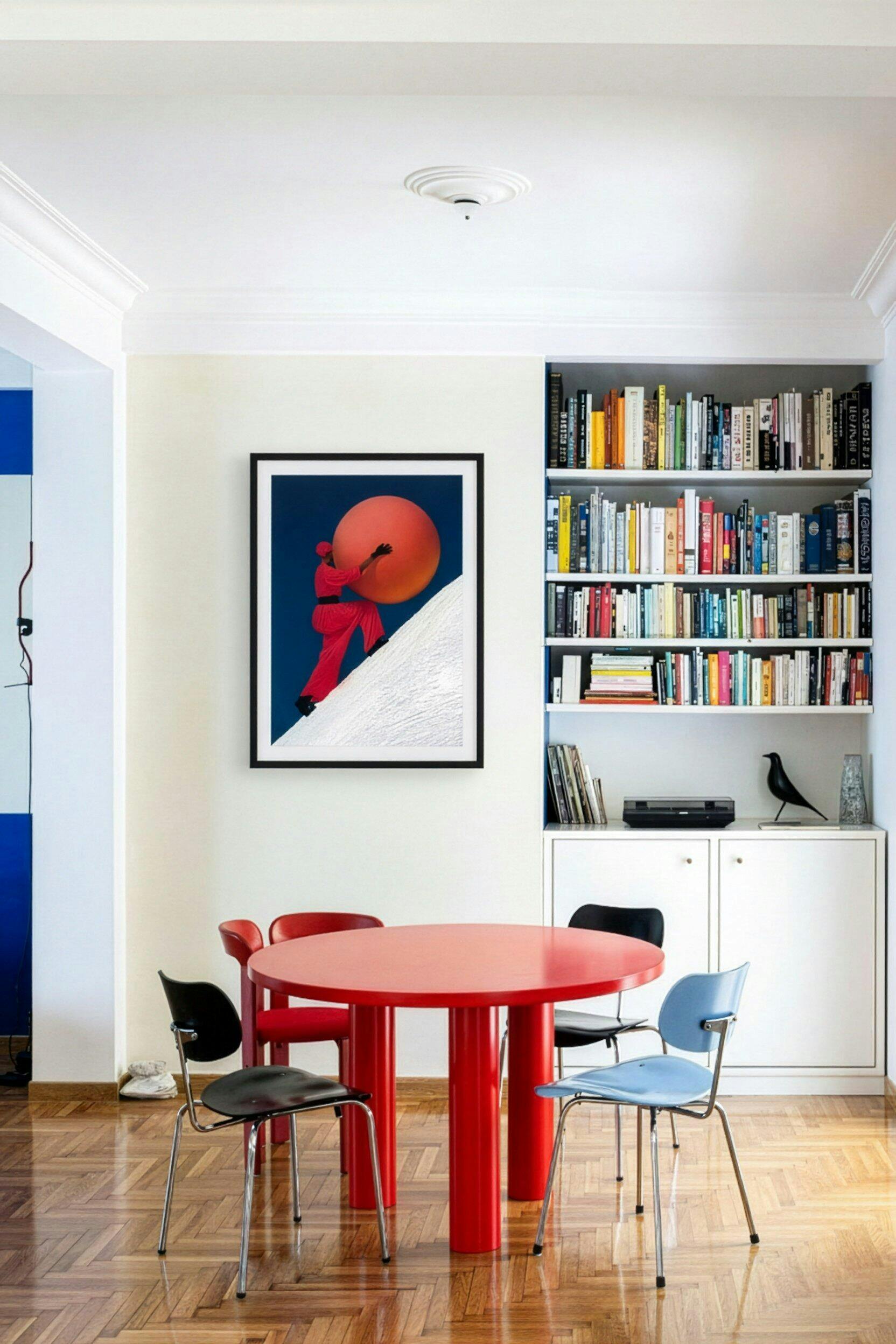 This piece instantly became the energy center of the room. Its bold contrast—red on blue, motion against stillness—pulls you in every time you walk past. I framed it in matte black to give it a crisp edge, and the texture of the paper adds depth you can’t catch in photos. It’s graphic, playful, and surprisingly grounding.