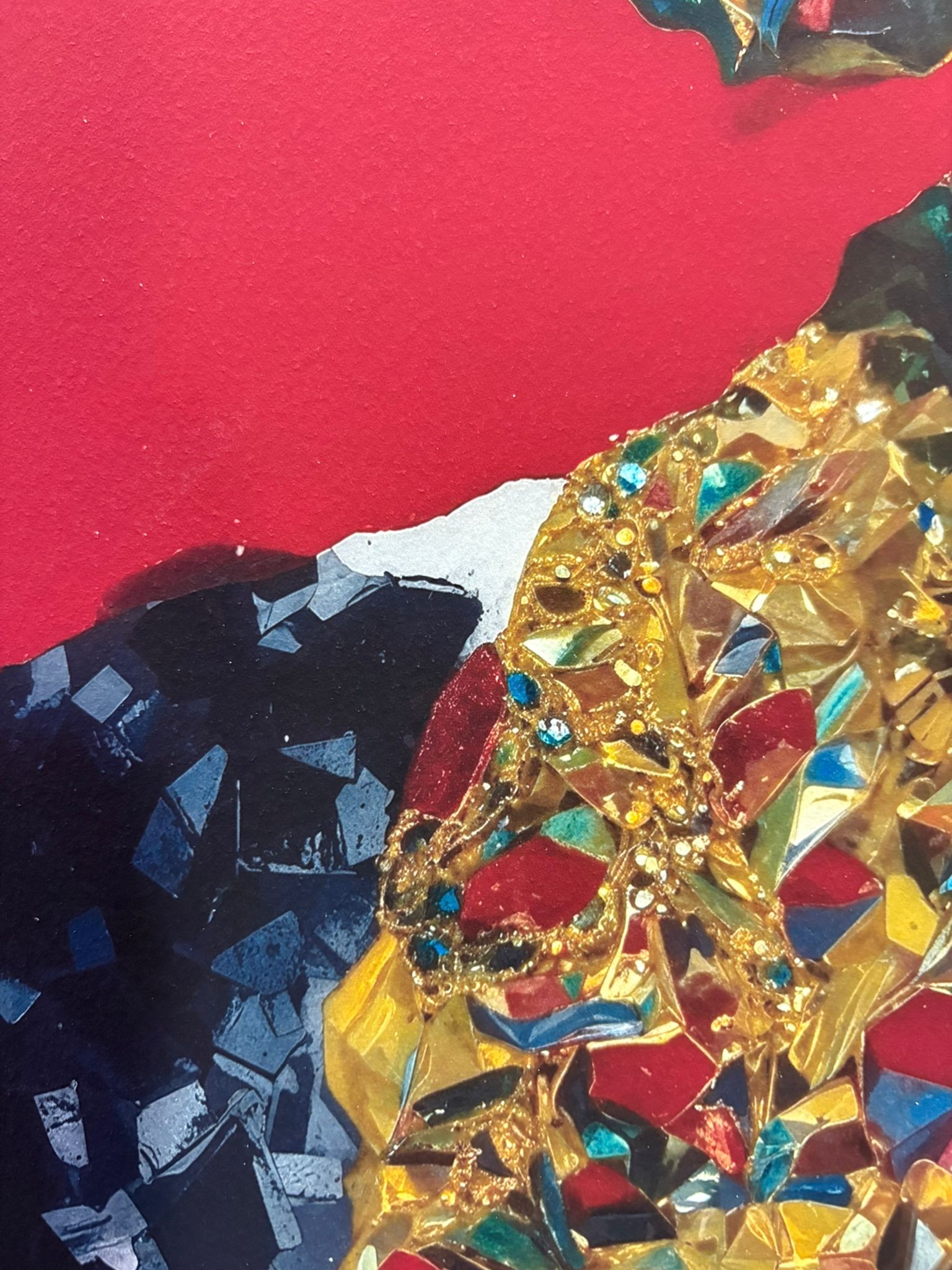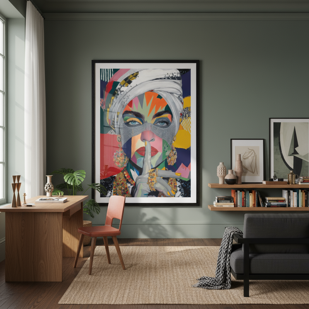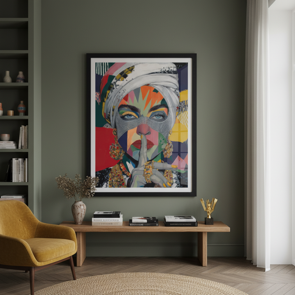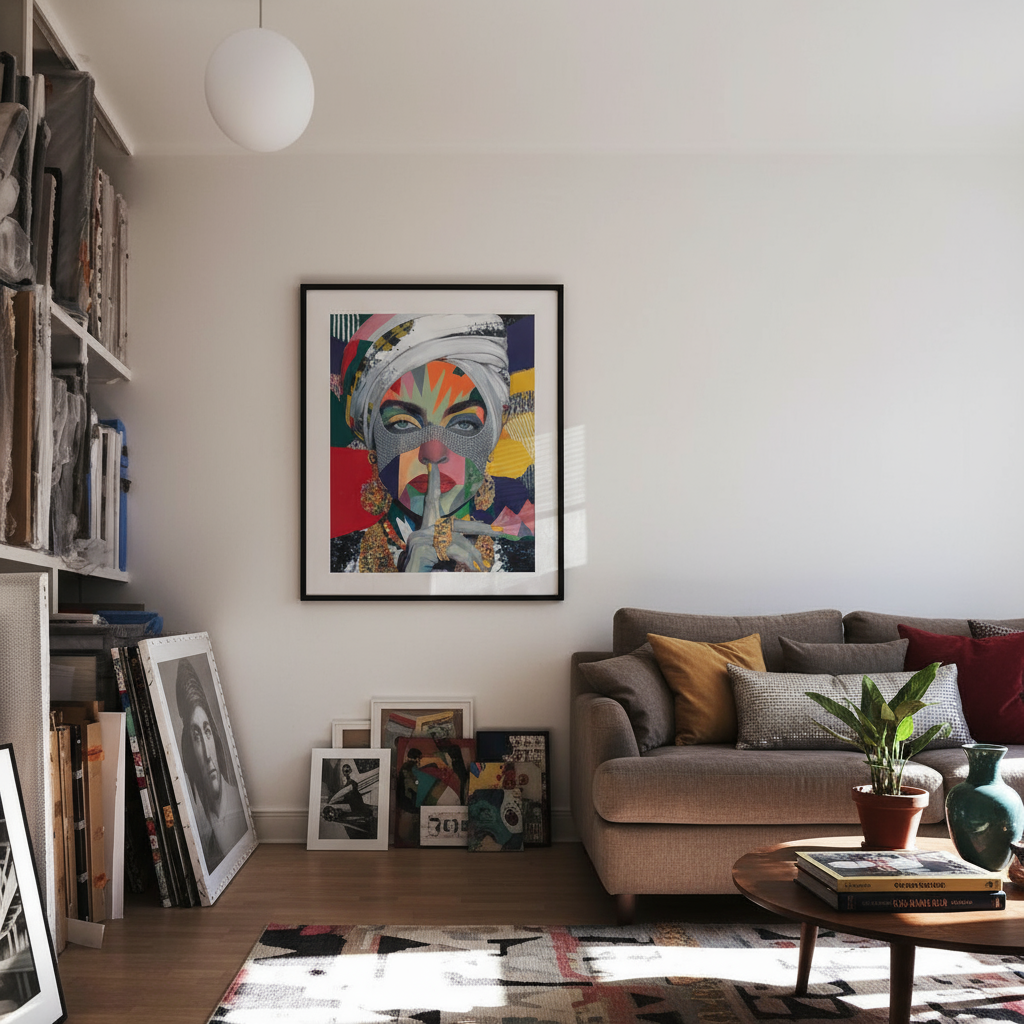 The piece draws you in instantly. The gaze, the gesture, the intricate collage of colors, it’s commanding without being overwhelming. Framed in white, it feels modern and crisp, but the emotion it carries is timeless.