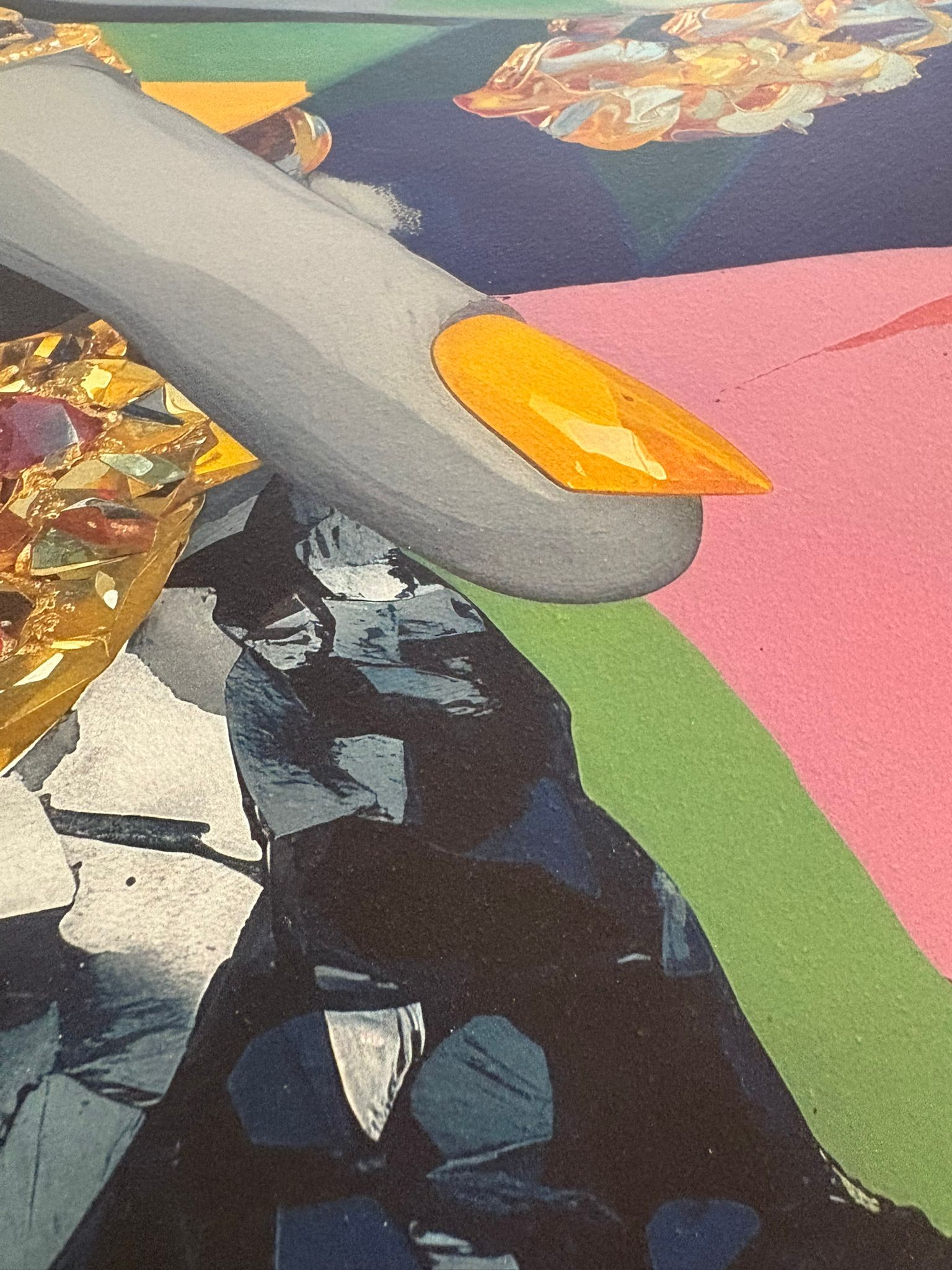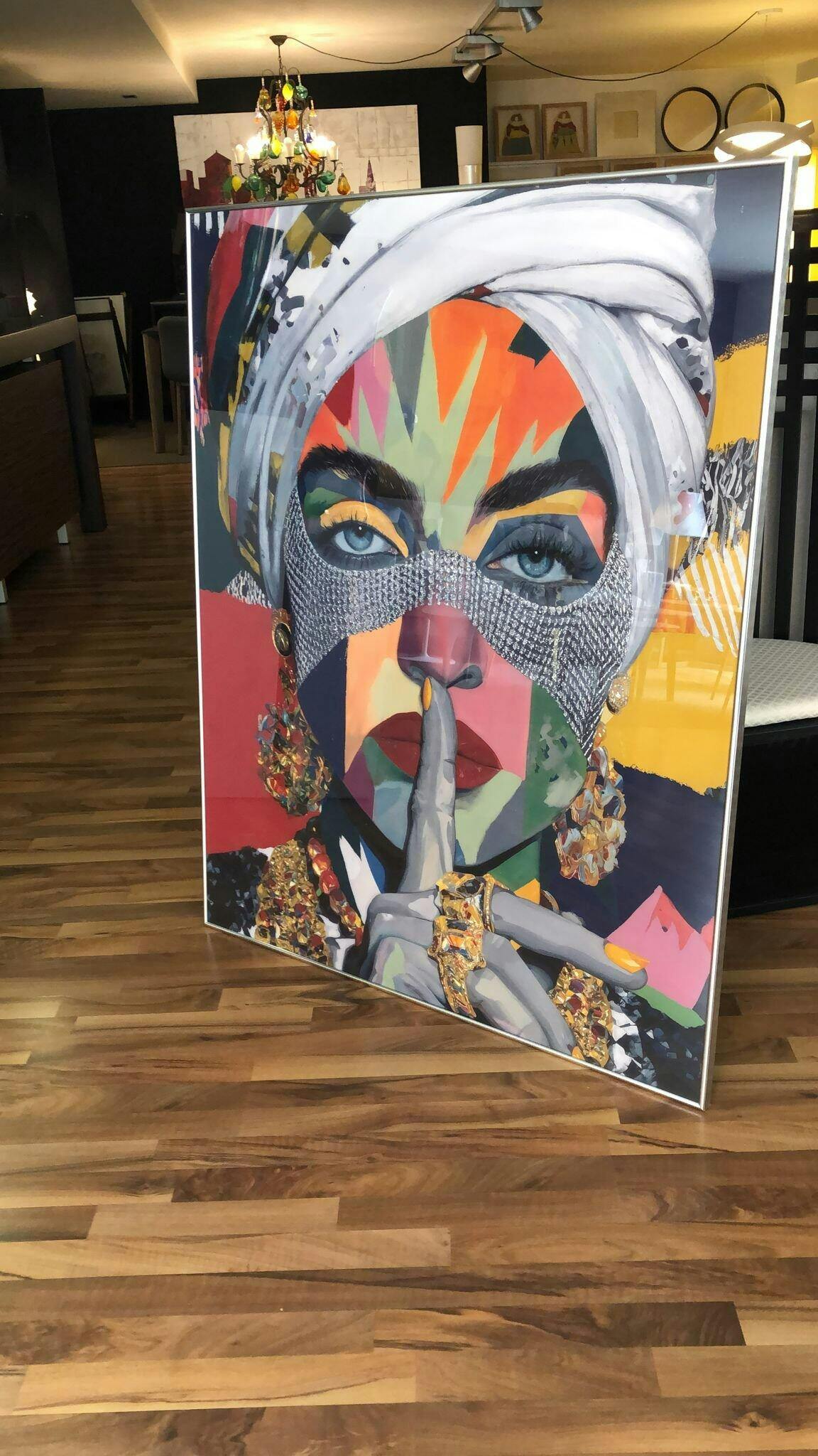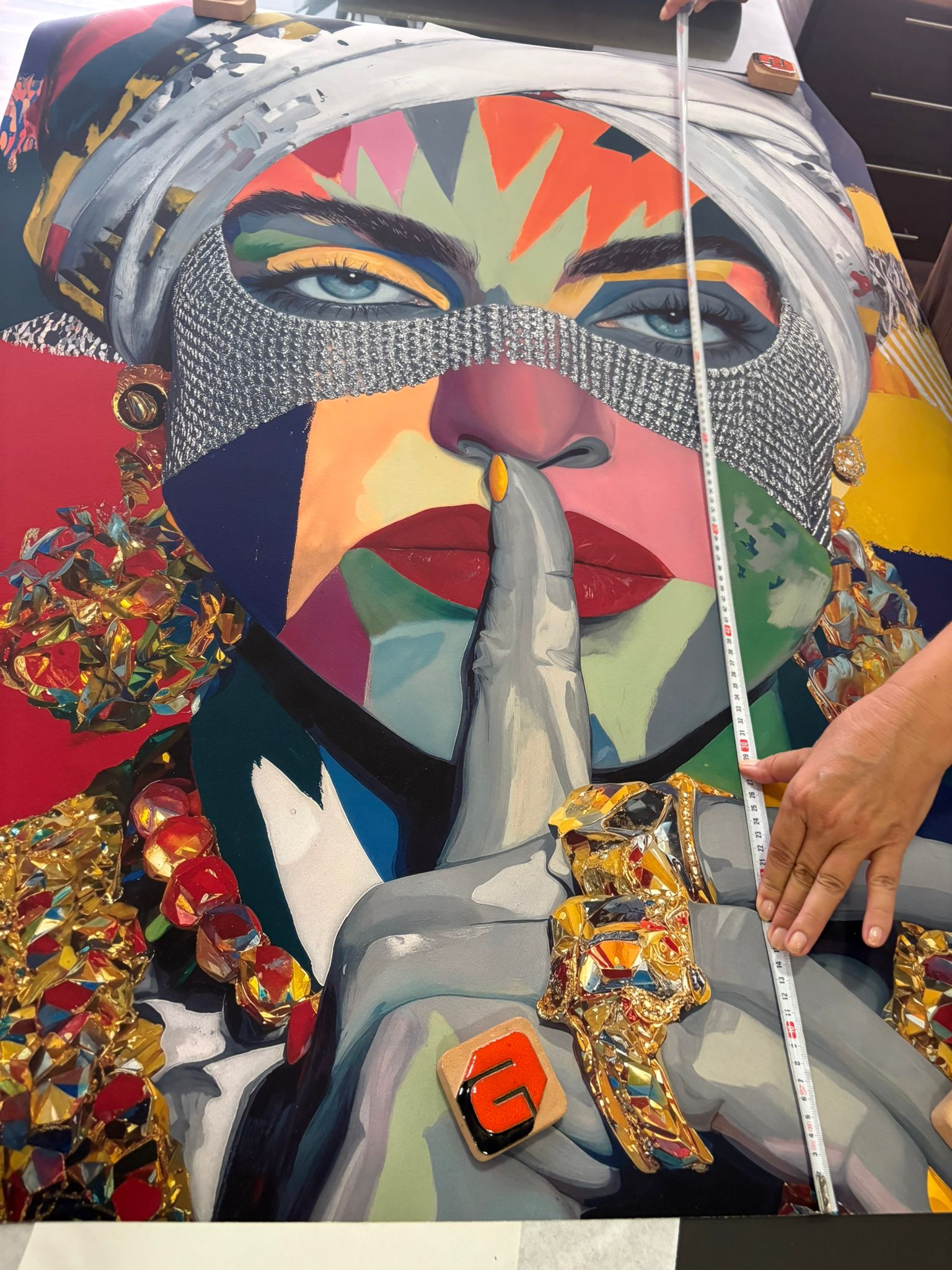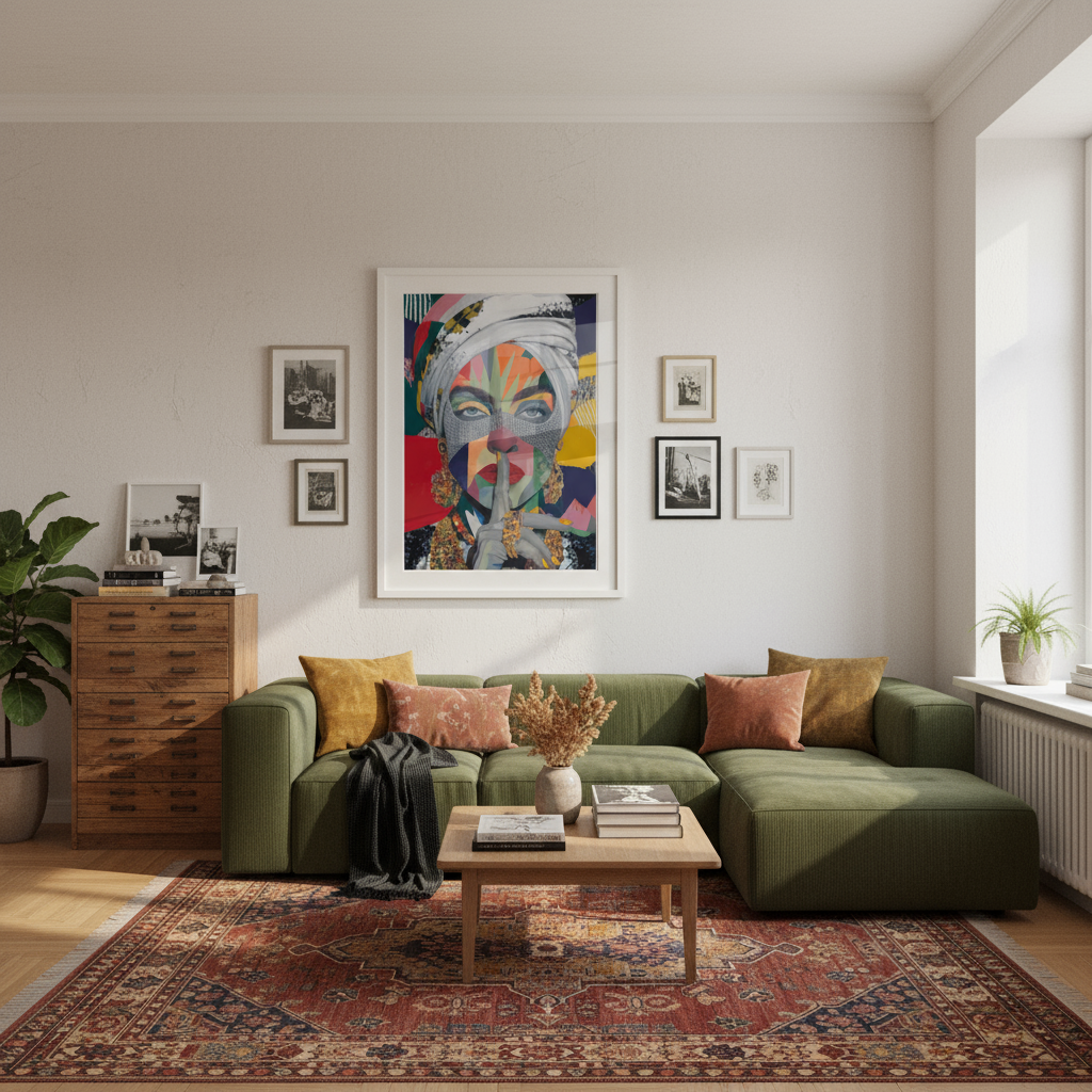 The piece draws you in instantly. The gaze, the gesture, the intricate collage of colors, it’s commanding without being overwhelming. Framed in white, it feels modern and crisp, but the emotion it carries is timeless.