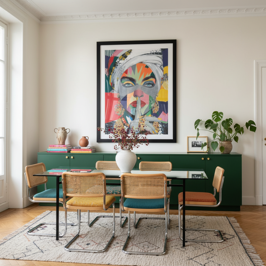 El marco es más que un simple complemento, es una extensión de la obra. Algunos prefieren la elegancia discreta de un diseño en negro, blanco o madera natural, mientras que otros apuestan por marcos con colores vibrantes, texturas o patrones que aportan personalidad. No hay una fórmula correcta, solo la que mejor conecte contigo.