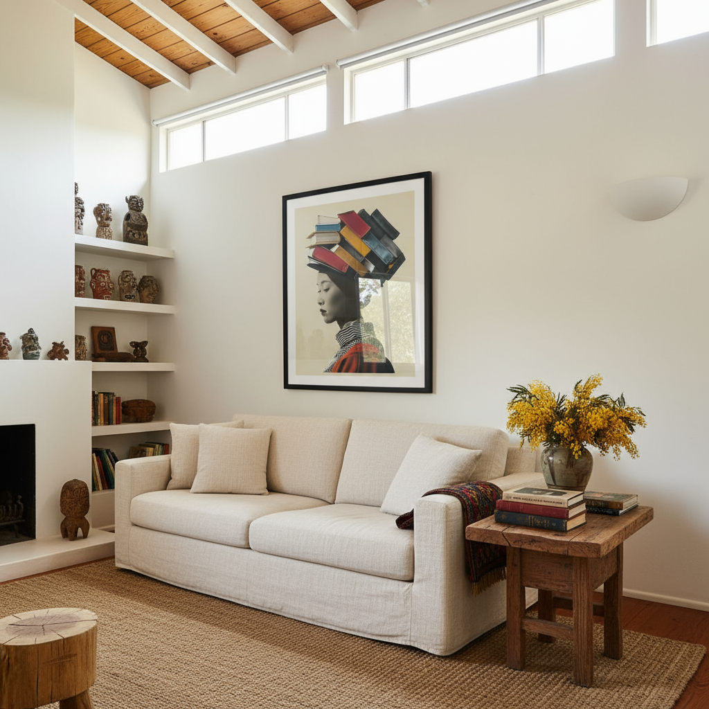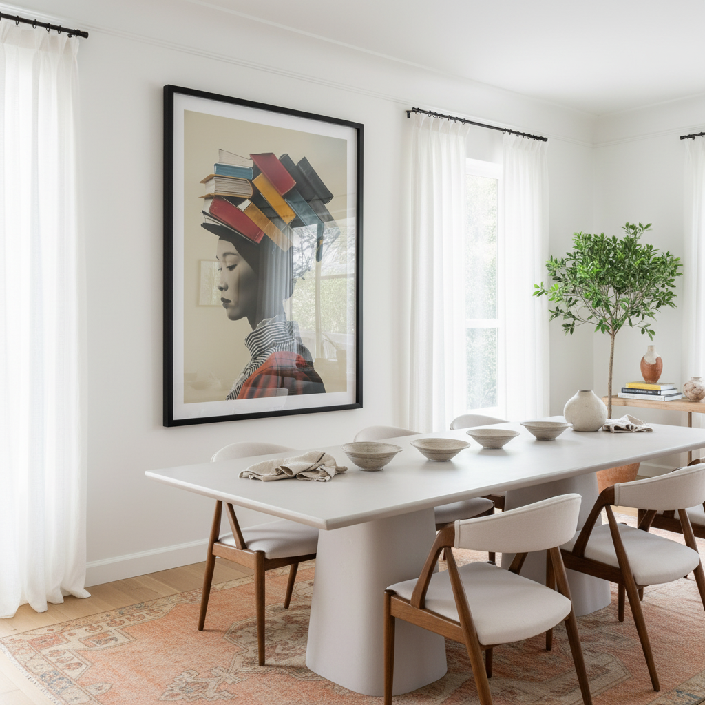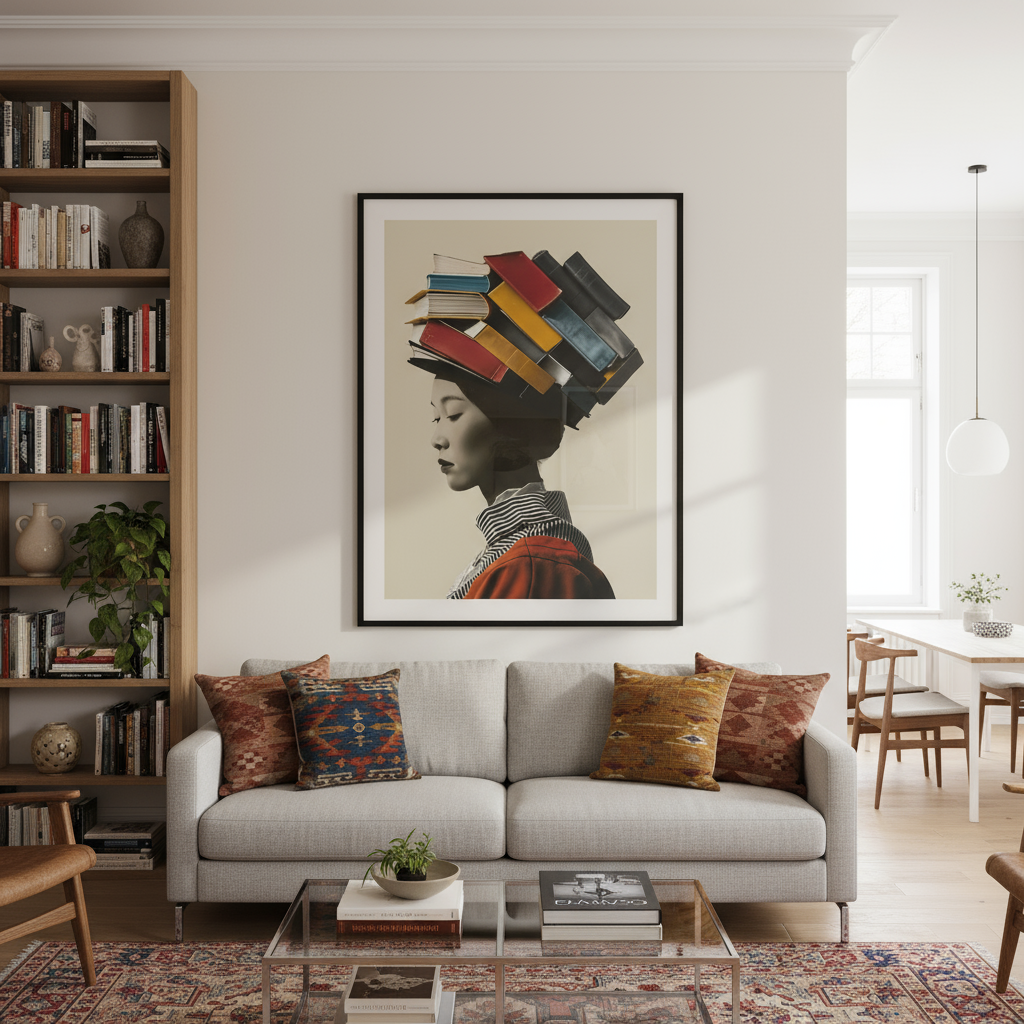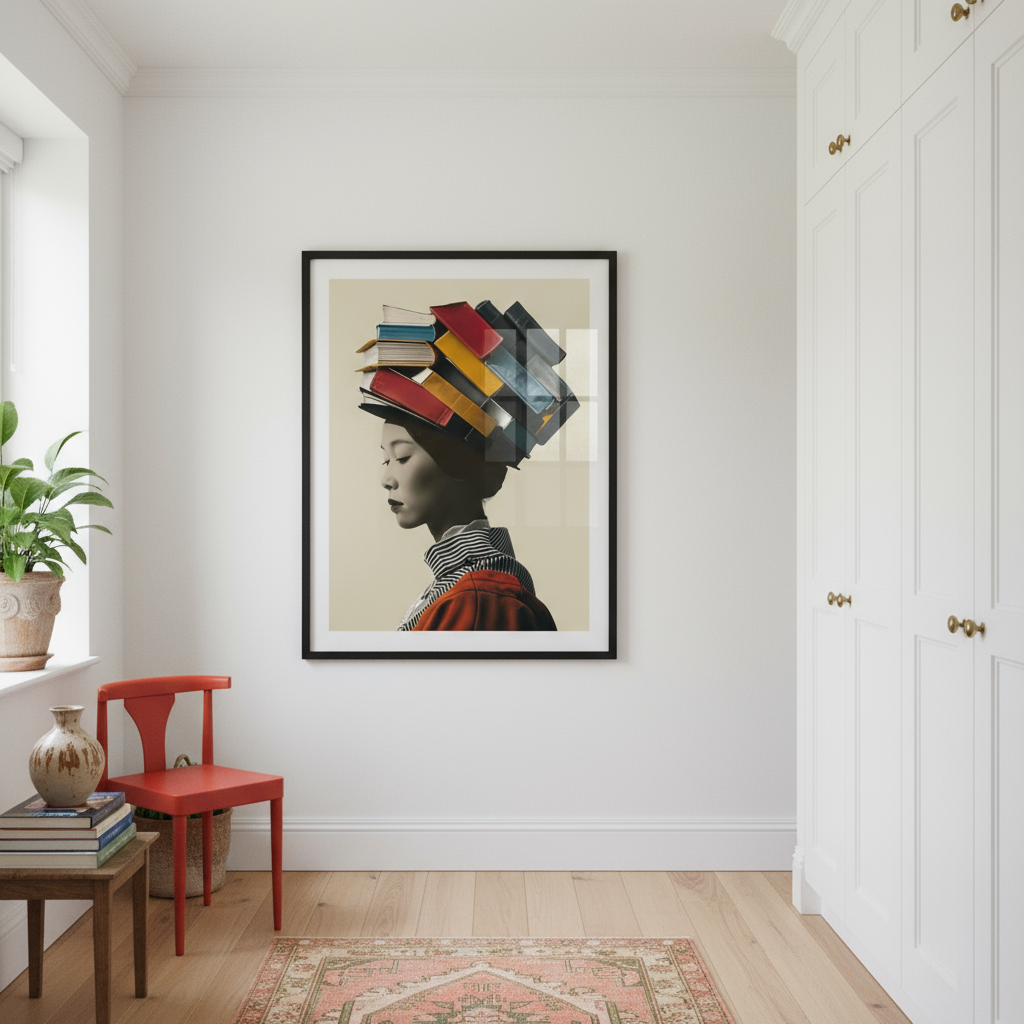 I placed her at the end of the hallway, and it changed everything. The colors of the books draw you in, but it’s her presence that stays with you. Calm, intelligent, powerful. It’s like she watches over the space in silence—strong without saying a word.