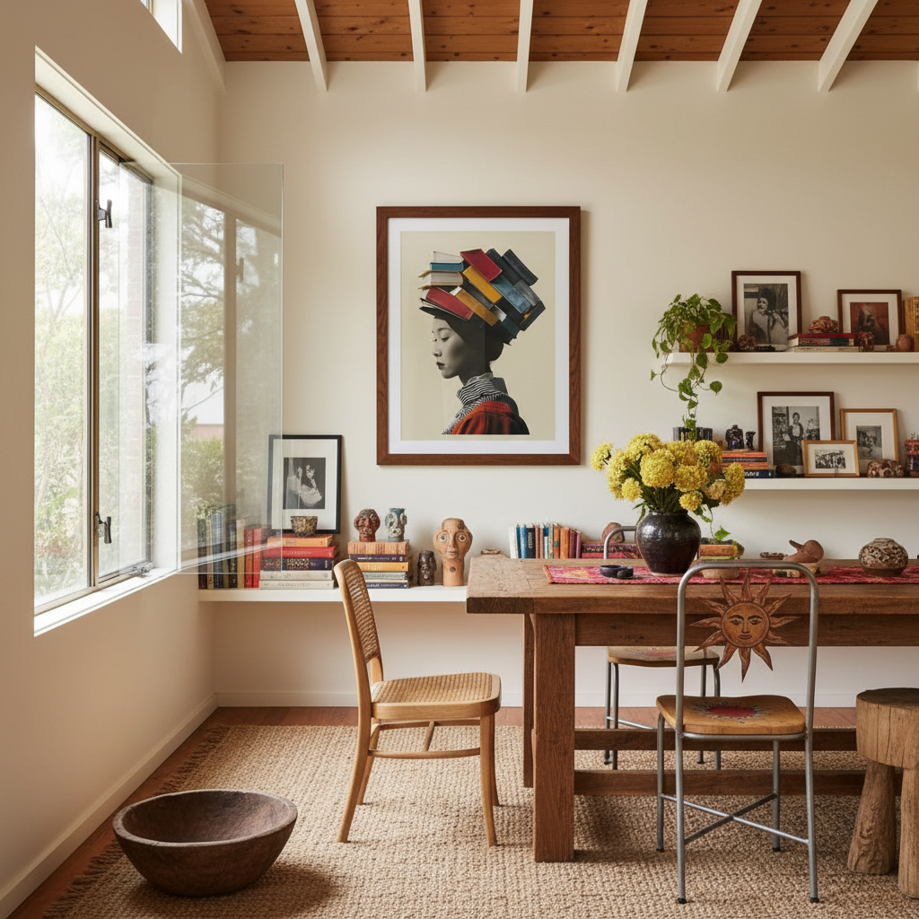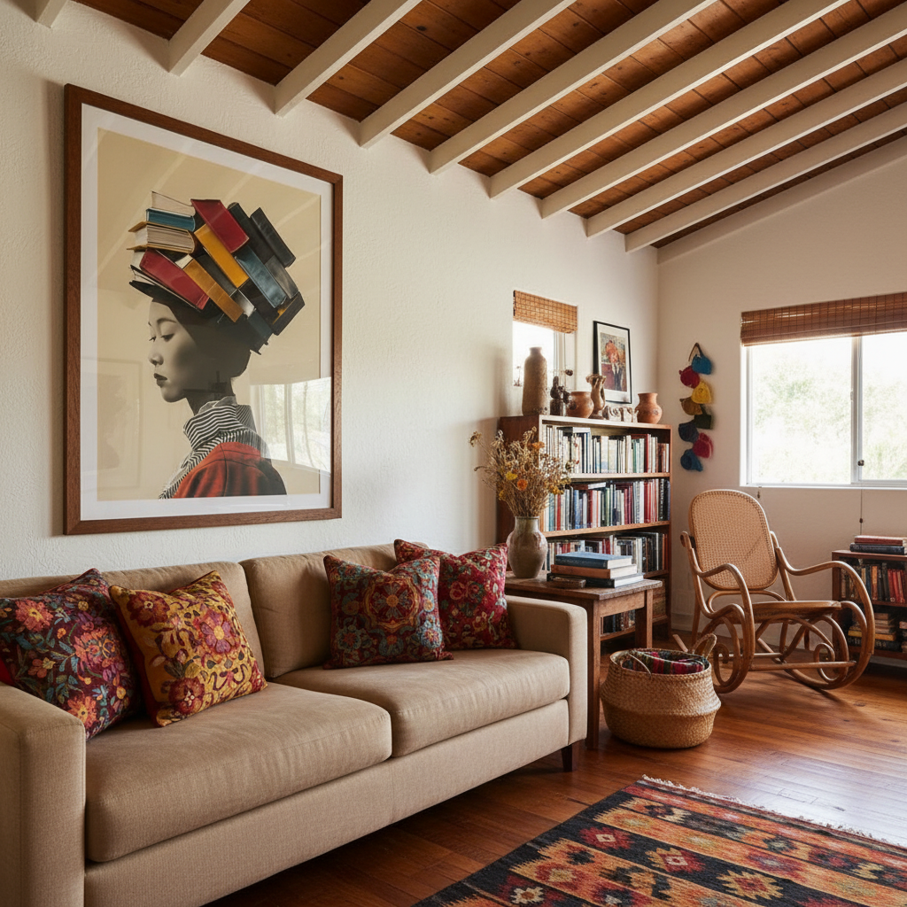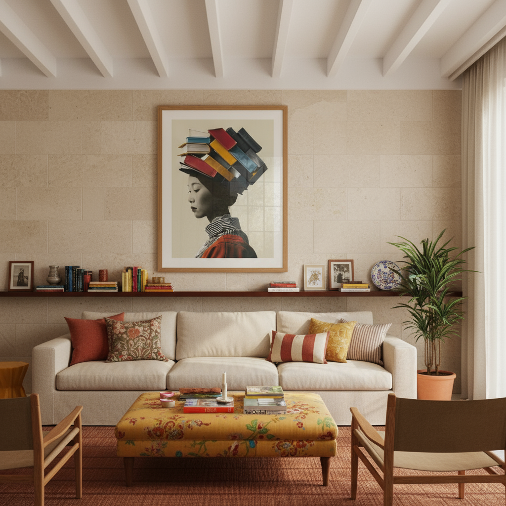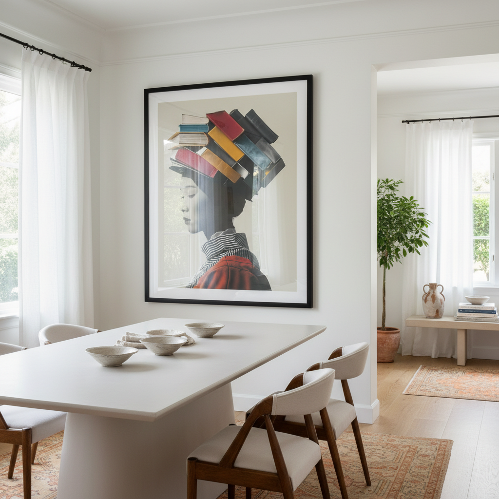 I placed her at the end of the hallway, and it changed everything. The colors of the books draw you in, but it’s her presence that stays with you. Calm, intelligent, powerful. It’s like she watches over the space in silence—strong without saying a word.